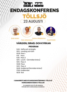 Endagskonferens 23 aug augusti 13, 2025 Publicerad av Thord Ekström Kommentarer inaktiverade för Endagskonferens 23 aug Världen, Israel och KyrkanTID 09:45 – 18:30 OBS! För lunch och kvällsmat krävs anmälan